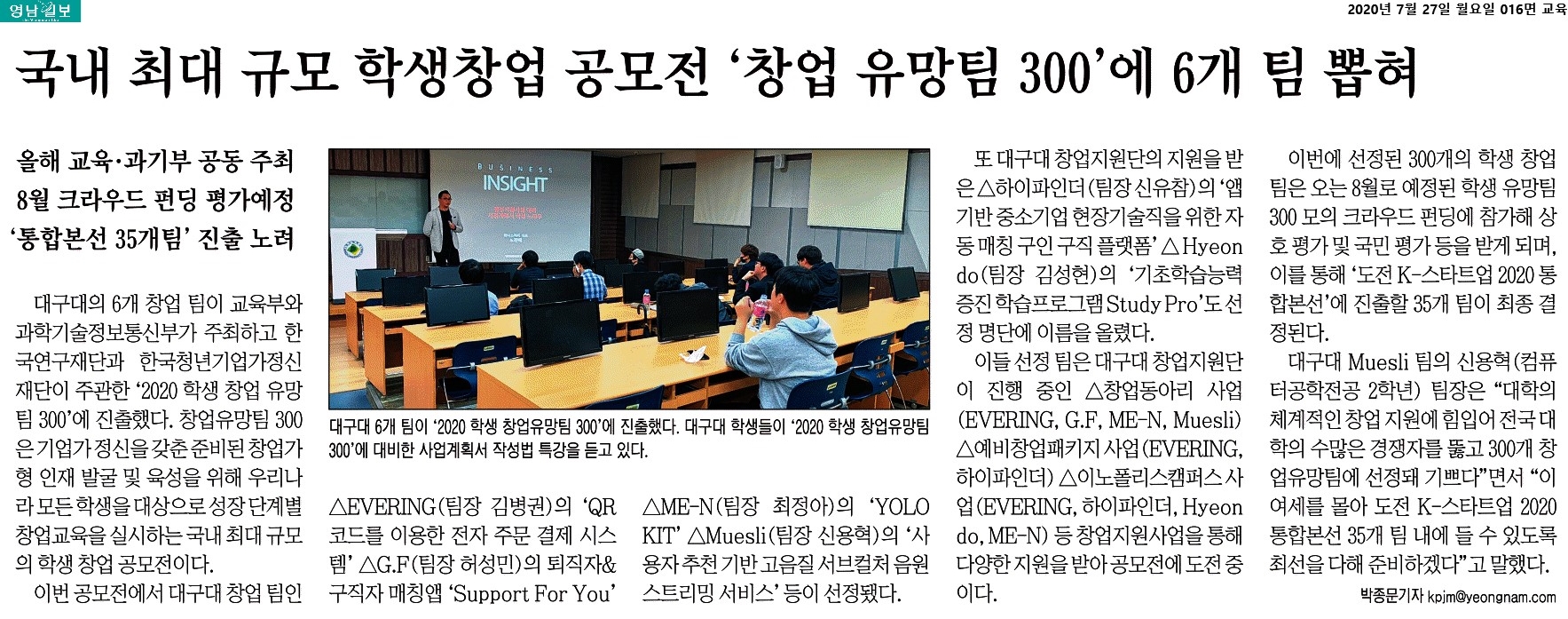 대구대 창업지원단, 국내 최대 규모 학생창업 공모전 창업 유망팀 300에 6개 팀 뽑혀 2020-07-27 11:12:13 |