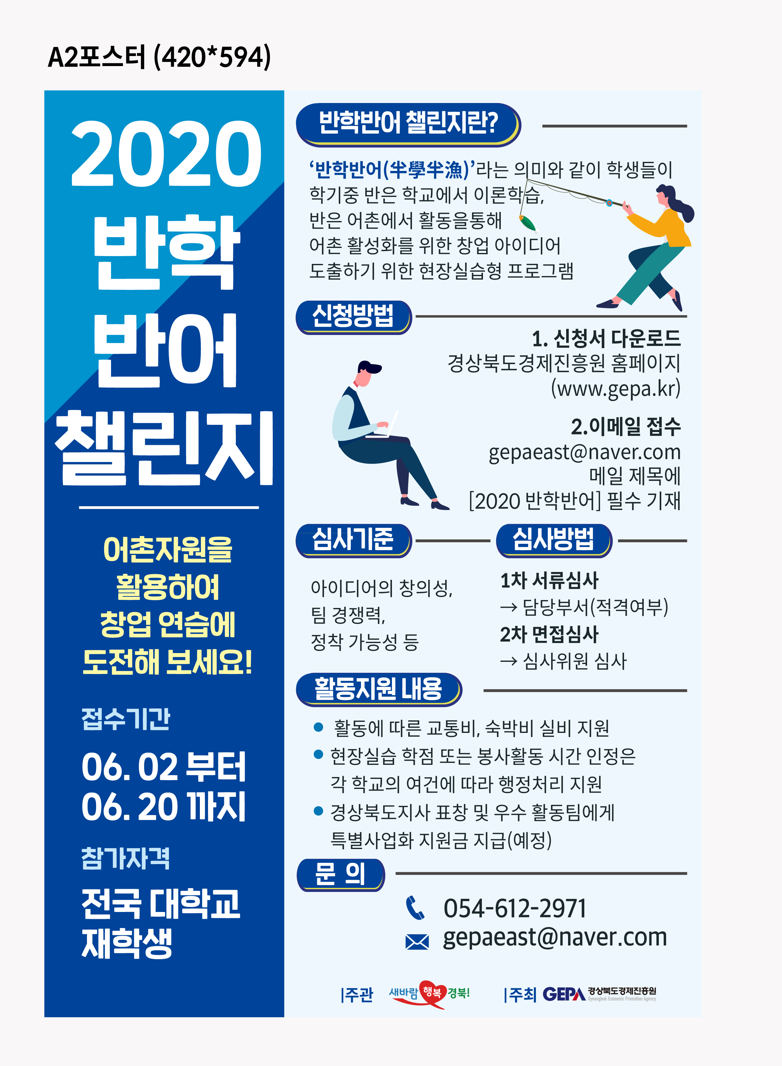 경북도에서는 인구감소 등 어려움을 겪고 있는 어촌지역에 청년(학생)유입을 통해 활력을 제고하고 청년창업과 일자리 창출을 위해 지난 해부터「반학반어 청년정착 지원사업」을 추진하고 있습니다. 많은 학생들의 참여바랍니다.