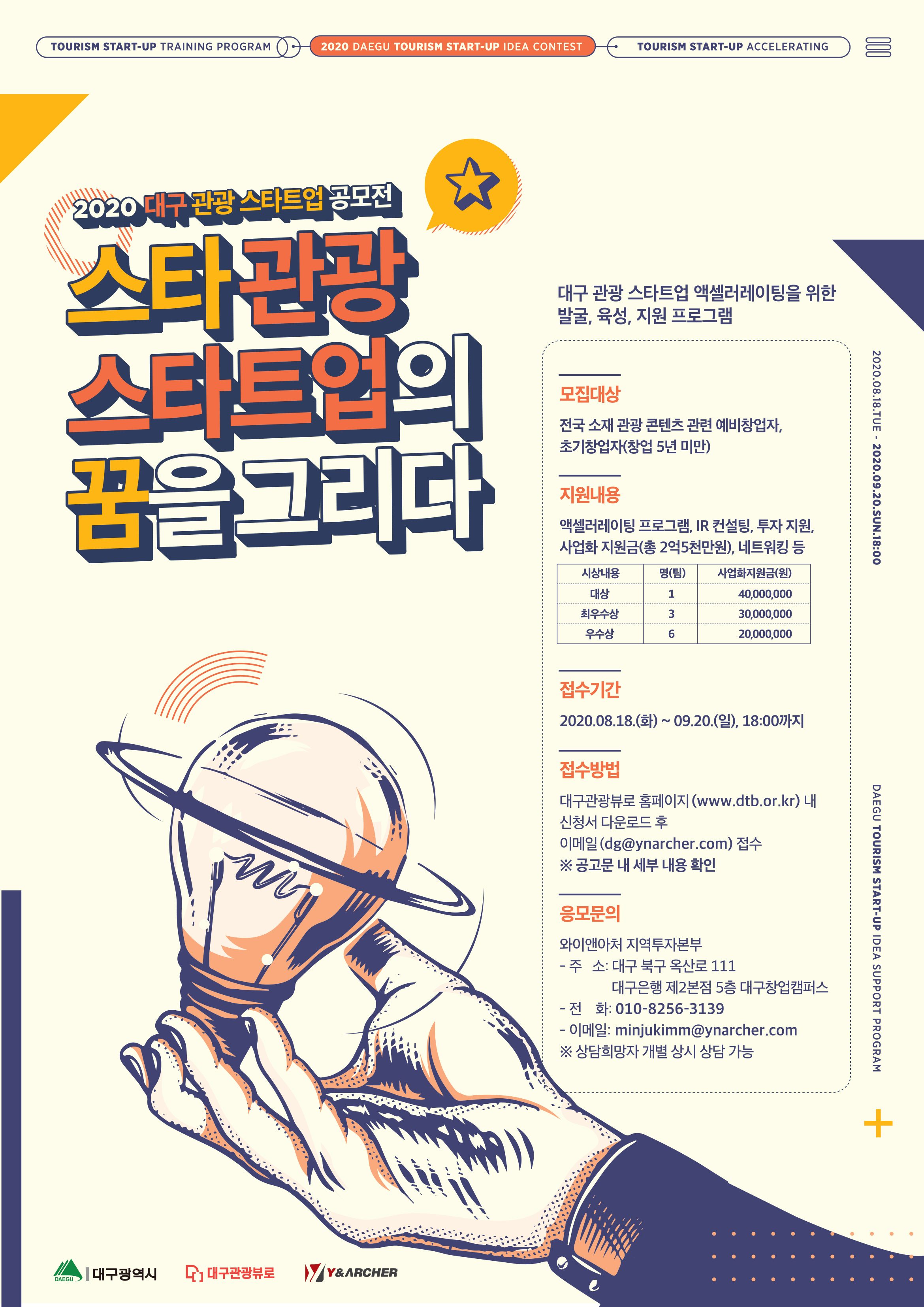 -------------------------------------------------------------------------------------------------------------------------- □ 공 모 명 : 대구 관광 스타트업 공모전 □ 공모기간 : 2020. 8. 18.(화) ~ 9. 20.(일), 18:00까지 □ 지원사항 : 사업화 지원, 엑셀러레이팅 프로그램 운영, 홍보·판로 개척, 투자유치 지원, 유관기관 네트워킹 등 □ 주최·주관 : 대구광역시, (사)대구관광뷰로 □ 모집대상 : 전국 소재 관광 콘텐츠 관련 예비창업자, 초기창업자(창업 5년 미만) ▷ 관광콘텐츠로 신규 사업을 계획 중인 예비창업자 ▷ 관광 관련 사업을 영위하고 있거나 기존 사업에 관광 콘텐츠를 활용한 제품(서비스)를 추가하여 신규 사업으로 계획 중인 창업 5년 미만 창업자 □ 모집분야 ▷ IT 기반형 : IT를 기반으로 한 관광사업으로 IT 자체가 수익모델인 사업 (스마트관광, 소셜플랫폼 사업) ▷ 시설기반형 : 활용 가능한 시설, 물적 기반으로 하는 사업 (숙박시설, 생태길, 공원, 카누, 생태마을 등) ▷ 체험기반형 : 인식 및 치유의 감성만족, 타분야 산업과의 융합, 직접 참여하여 느끼고 공감할 수 있는 체험 중심 사업 (지역축제, 뷰티케어, 드라마·행사·전시 연계 관광, 마음치유여행 등) ▷ 기타 : 타 유형에 속하지 않은 창의적인 관광 사업 □ 접수방법 : 대구관광뷰로 홈페이지(www.dtb.or.kr) 혹은 첨부파일의 신청양식 작성 후 이메일(dg@ynarcher.com) 접수 □ 문 의 처 : 와이앤아처 주식회사 지역투자본부 ☏ 010-8256-3139 / minjukimm@ynarcher.com |