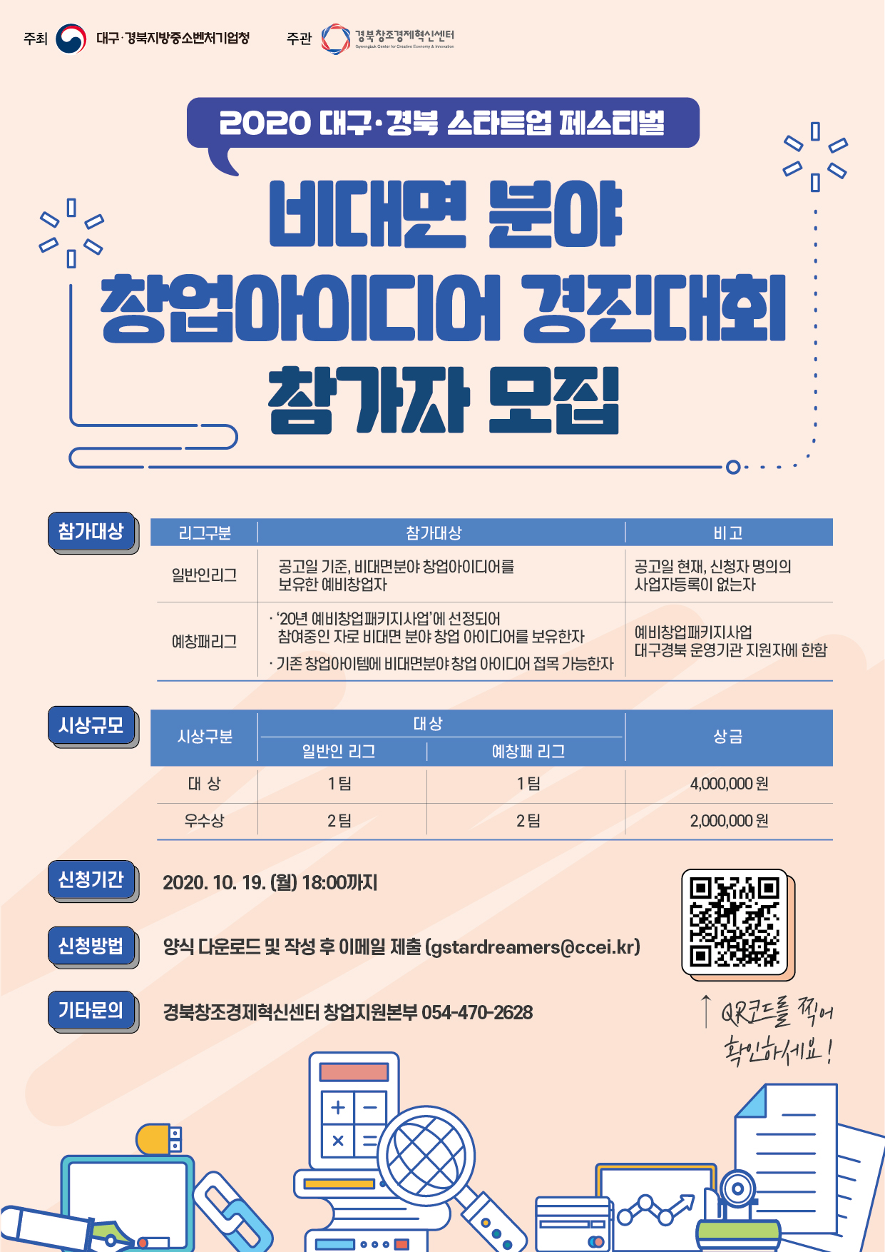 2020 대구·경북 스타트업 페스티벌 "비대면 분야 창업아이디어 경진대회" 참가자를 모집하고 있습니다. 예비창업자와 예비창업패키지 사업 지원기업의 적극적인 참여 바랍니다. ○ 대 회 명 : 2020 대구경북 스타트업 페스티벌 비대면분야 창업아이디어 경진대회
