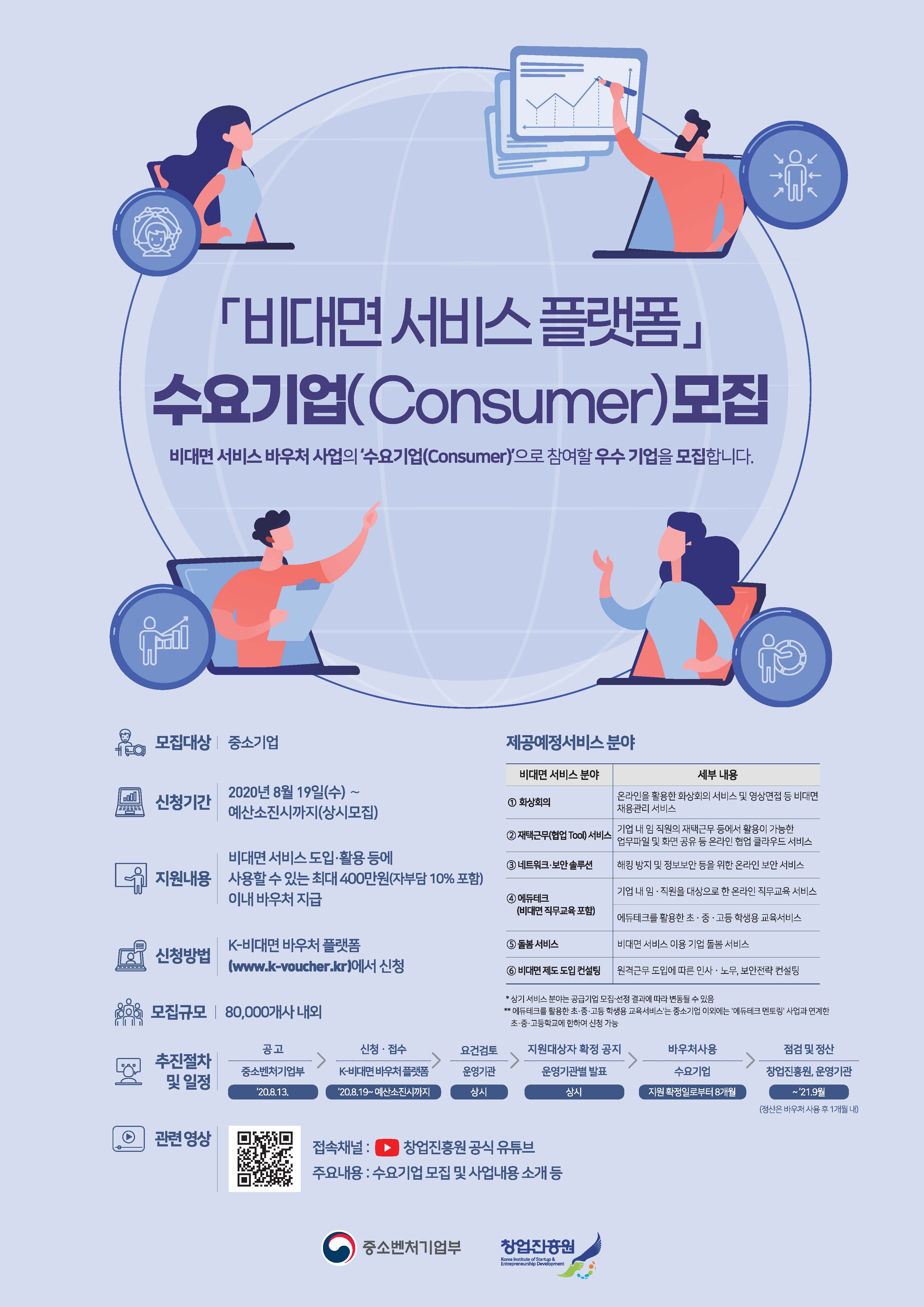 가. 사업목적 : 화상회의, 재택근무 등 서비스 지원을 통한 중소벤처기업의 디지털화 촉진 및 비대면 서비스 분야 육성 나. 모집대산 : 중소기업 다. 모집규모 : 80,000개사 내외 라. 모집방식 : 상시모집 마. 지원내용 : 비대면 서비스 도입 및 활용 등에 사용할 수 있는 최대 400만원 이내 바우처 지급 바. 상세내용 : 첨부파일 참조 |