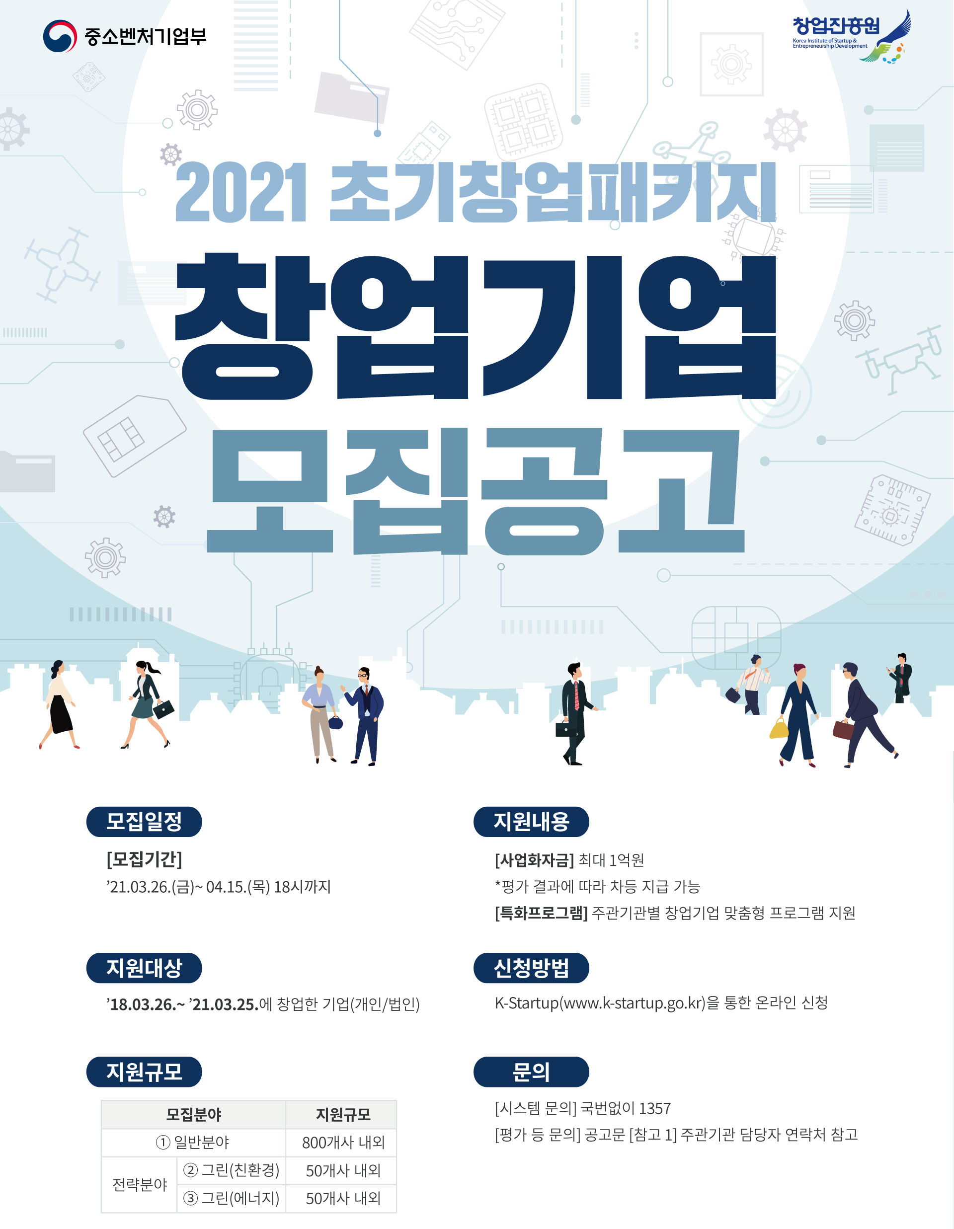 [안내] 2021년 초기창업패키지 지원사업 창업기업 모집 공고(~'21. 4. 15.(목) 18:00까지) 2021-03-29 14:40:07 |