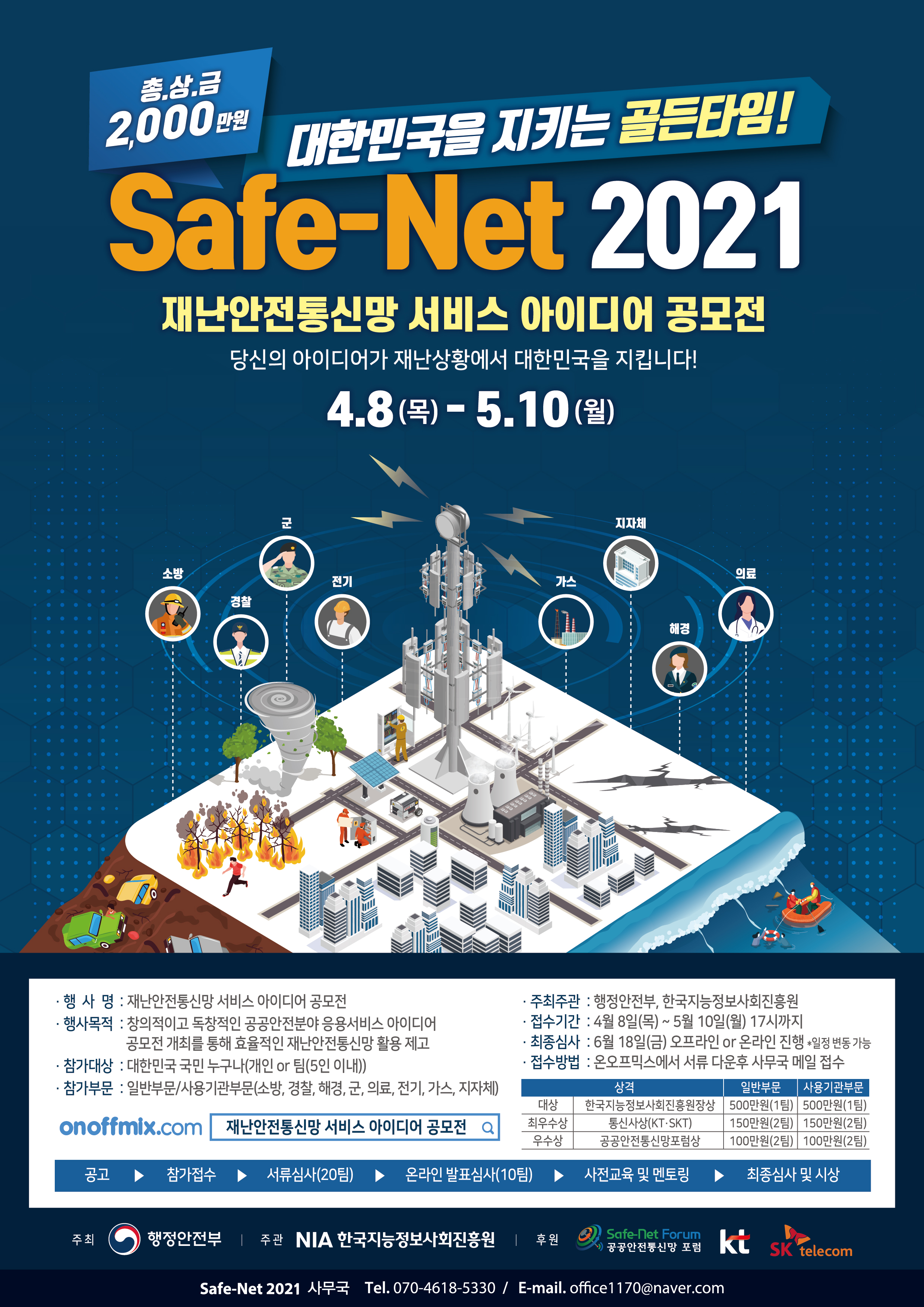 [안내] Safe-Net 2021 재난안전통신망 서비스 아이디어 공모전 2021-04-27 13:07:13 |