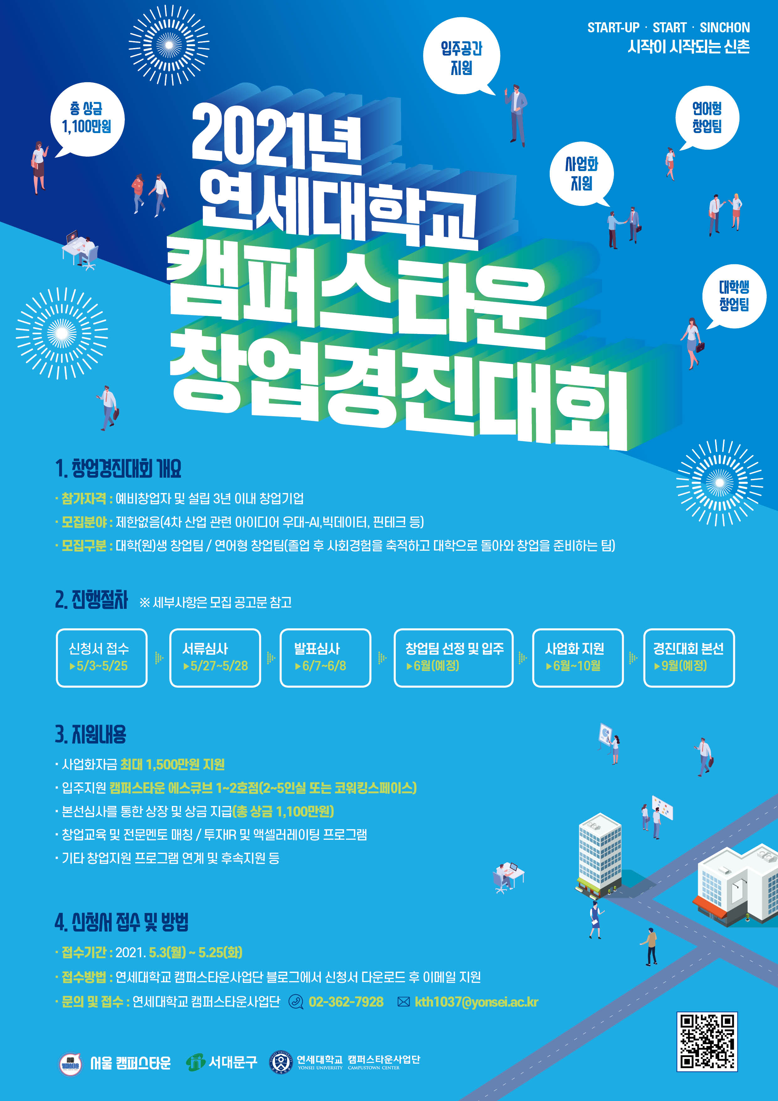 1. 행사명 : 2021년 연세대학교 캠퍼스타운사업 창업경진대회 2. 참가대상 : 창업에 관심 있는 (예비)창업자 및 3년 이내 창업팀 3. 선발규모 : 55개 팀 내외 가. 대학생 창업팀: 30팀 내외 나. 연어형 창업팀: 25팀 내외 * 연어형: 졸업 후 사회로 진출하여 경험을 축적하고 다시 대학으로 돌아와 창업을 준 비하는 팀 4. 신청기간: 2021. 5. 3.(월) ~ 2021. 5. 25.(화) 15:00 까지 5. 지원내용 가. 사업화 지원금: 아이템 개발비 최대 1,500만원 나. 상장 및 상금: 대상(1팀) 500만원, 최우수(1팀) 300만원, 우수(3팀) 100만원 다. 입주지원: 무료 창업 공간(에스큐브, 6월 예정) |