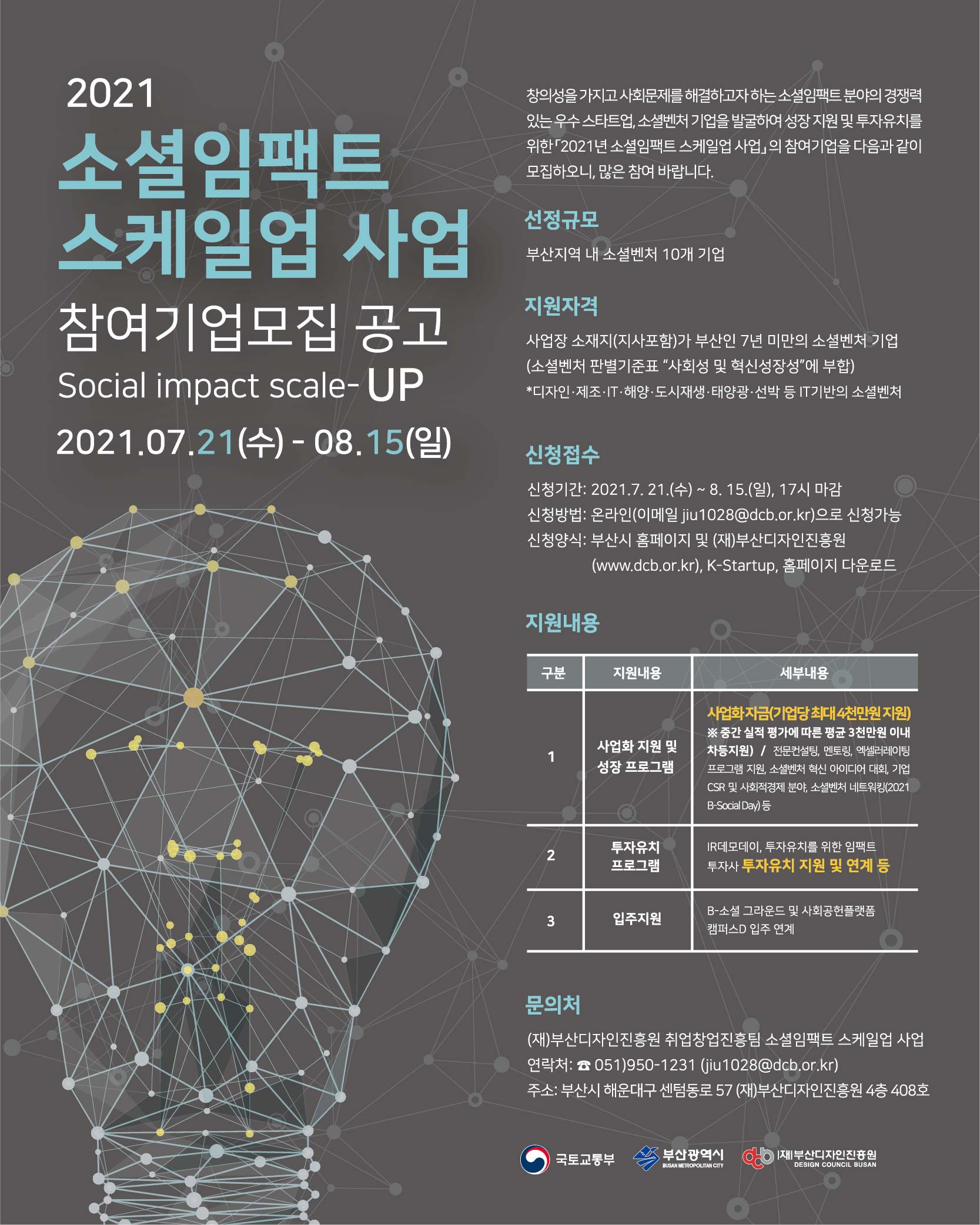 나. 모집기간 : 2021. 07. 21.(수)~8. 15.(일), 17:00까지 다. 지원기간 : 2021. 8. ~ 2022.3. 라. 선정규모 : 부산지역 사업장 소재지(지사포함) 소셜벤처 10개 사 마. 지원내용 : 사업화 자금(기업당 최대 4천만원 지원), 성장프로그램(엑셀러레 이팅, 네트워킹 등), 투자유치 지원 및 연계 등 바. 신청방법 : 온라인(이메일 jiu1028@dcb.or.kr)으로 신청가능 ※신청양식은 부산시, 부산디자인진흥원, K-startup홈페이지에서 다운로드 가능 사. 문 의 처 : (재)부산디자인진흥원 취업창업진흥팀 (051.950.1231/1232) |