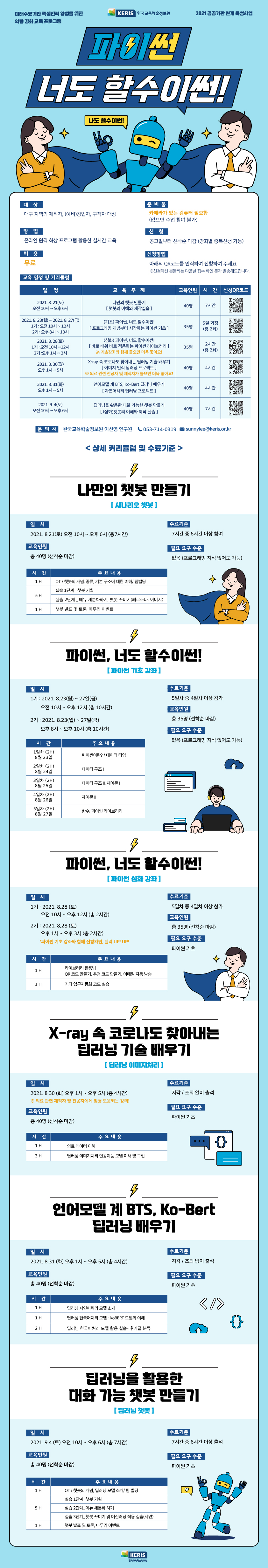 [안내] [한국교육학술정보원]2021 공공기관 연계 육성사업(오픈랩연계) 교육 프로그램 2021-08-17 09:26:45 |