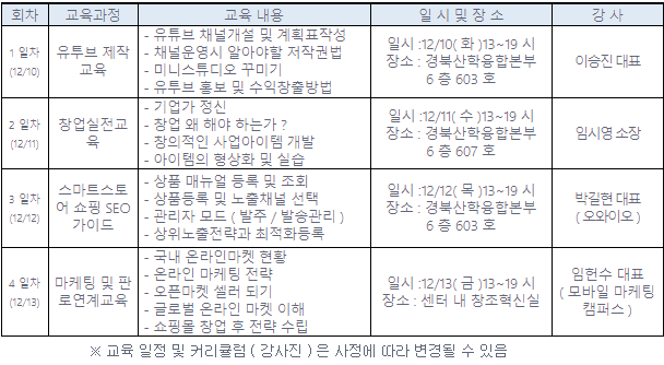 1. 교육목적 ◦ 지역 내 1 인 크리에이터 , 소상공인 , 대학생 , 예비창업기업을 대상으로 창업 실전지식 ( 아이템선정 , 비지니스모델 설계 , 자금 조달 , 기초회계 ) 전달 및 창업활성화 인식제고. ◦ 유튜브제작 , 스마트 스토어 ( 스토어팜 ) 운영 , SNS 홍보를 활용한 PC 와 모바일에서 온라인 마켓 개설 및 전산 실습교육을 통하여 예비창업기업 및 지역 소상공인들의 마케팅 판로 연계. 2. 교육개요 □ 과 정 명 : 12 월 창업활성화 1 차 교육 『 온라인 판매특공대 ! 』 - 일 시 : 2019. 12. 10( 화 )~13( 금 ) / 13:00~19:00 (4 일 과정 . 1 일 6 시간 , 총 24 시간 ) - 장 소 : 경북산학융합본부 6 층 603 호 / 경북창조경제혁신센터 혁신실 - 교육대상 : ( 예비창업자 , 창업초기기업 , 일반인 , 대학생등 ) □ 신청절차 ○ ( 신청기간 ) 공고일로부터 ~ 2019.12.09 ( 월 ) 18:00 까지 ○ 참여시 준비물 - 본인명의 스마트폰 ( 필수 )/ 네이버 Id, 비번 알아오기 ○ ( 신청방법 ) 참여 신청서 ( 이메일접수 / 전화접수가능 ) - 접수 방법 : pyj112@ccei.kr - 접수 문의 : 054) 470-2652 경북센터 창조사업본부 창업인프라팀 - 찾아오시는길