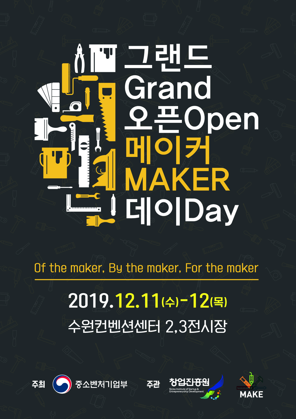 ■ 행 사 명 : 2019 그랜드 오픈 메이커 데이 ■ 일 자: 2019. 12. 11.(수) ~ 12. 12.(목) ■ 장 소: 수원컨벤션센터 1층 전시홀(경기도 수원시 영통구 광교중앙로 140(하동)) ■ 행사내용: 메이커 스페이스, 메이커 문화 확산 우수사례 발표 및 전시체험, 협업기회 제공 등